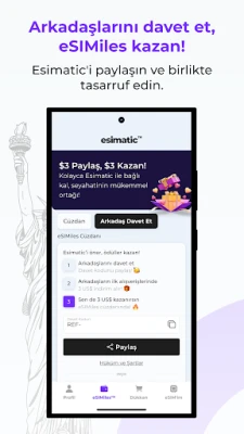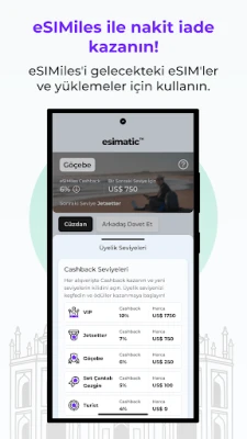 Esimatic deneyimi sadece hızlı ve uygun fiyatlı internetle sınırlı değil; sadık kullanıcılarını ödüllendiren eSIMiles™ programıyla daha da zenginleşir. Uygulama içi satın alımlarınızda %10'a varan kredi kazanabilir, bu kredileri gelecekteki eSIM alımlarınızda kullanabilirsiniz. Arkadaşlarınızı davet ederek hem onlara avantaj sunabilir hem de kendiniz ek eSIM kredileri kazanabilirsiniz. Sık seyahat edenler, dijital göçebeler, uzaktan çalışanlar, öğrenciler veya yüksek dolaşım faturalarından kaçınmak isteyen herkes için ideal olan Esimatic, size havalimanı lounge erişimi gibi özel VIP ayrıcalıkları bile sunabilir. Esimatic ile sorunsuz, güvenli ve esnek bir mobil bağlantı deneyiminin keyfini çıkarın.