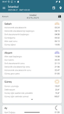 Açık hava etkinliklerinizi planlarken en doğru gündoğumu, günbatımı ve altın saat verilerine anında ulaşın. Fotoğrafçılardan yürüyüşçülere kadar herkes için vazgeçilmez bir araç. Doğanın en güzel anlarını kaçırmayın ve her planınızı mükemmel zamanlayın.
